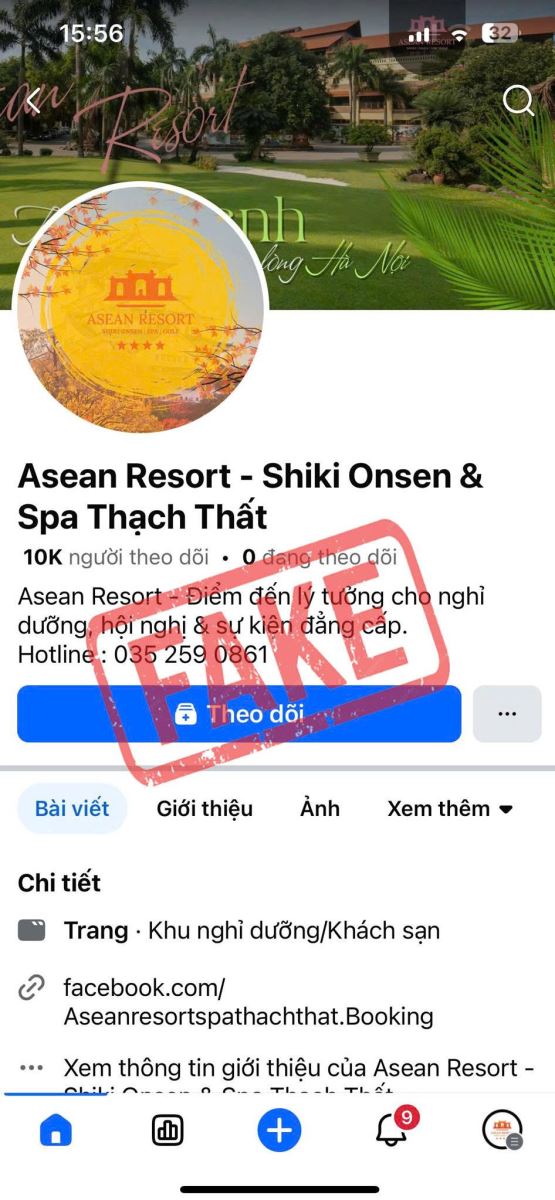 - Mạo danh fanpage Asean Resort hoặc tạo fanpage có tên và hình ảnh tương tự fanpage chính thức.